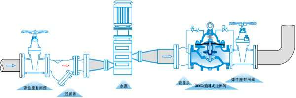 300X缓闭止回阀由主阀、单向阀、针阀、球阀、微形过滤器和压力表组成水力控制接管系统。利用水力自动操作,可使主阀的开启或关闭速度。防止水锺水击的产生,以达到缓闭消声的效果。